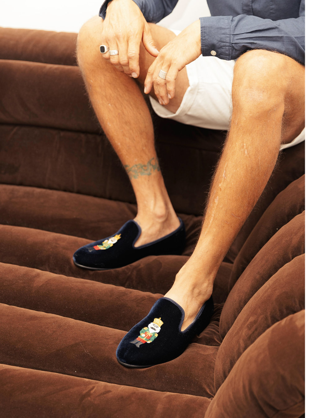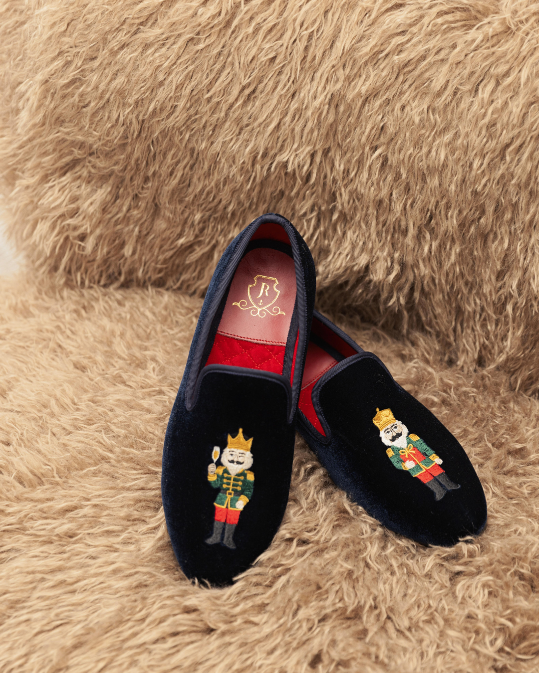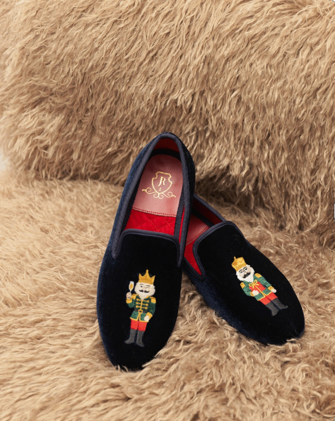Crafted in midnight navy velvet with quilted red lining, each pair features an intricately embroidered nutcracker— a toast (and a wink) to good times.